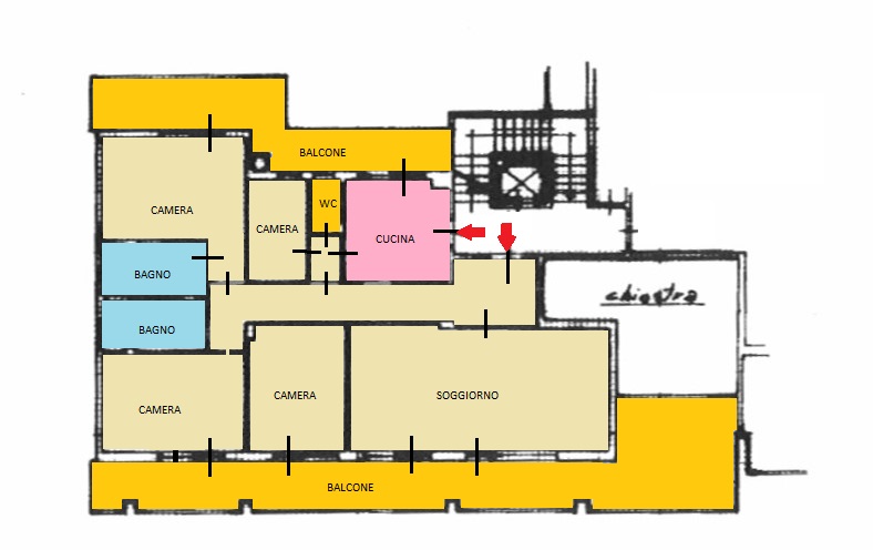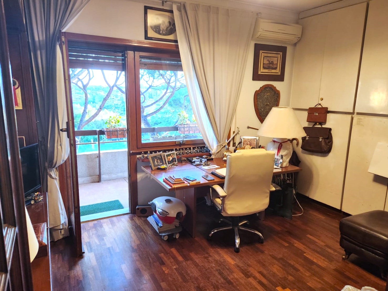 cucina abitabile con balcone di servizio, tre camere da letto, studio, due bagni e ripostiglio con lavanderia;