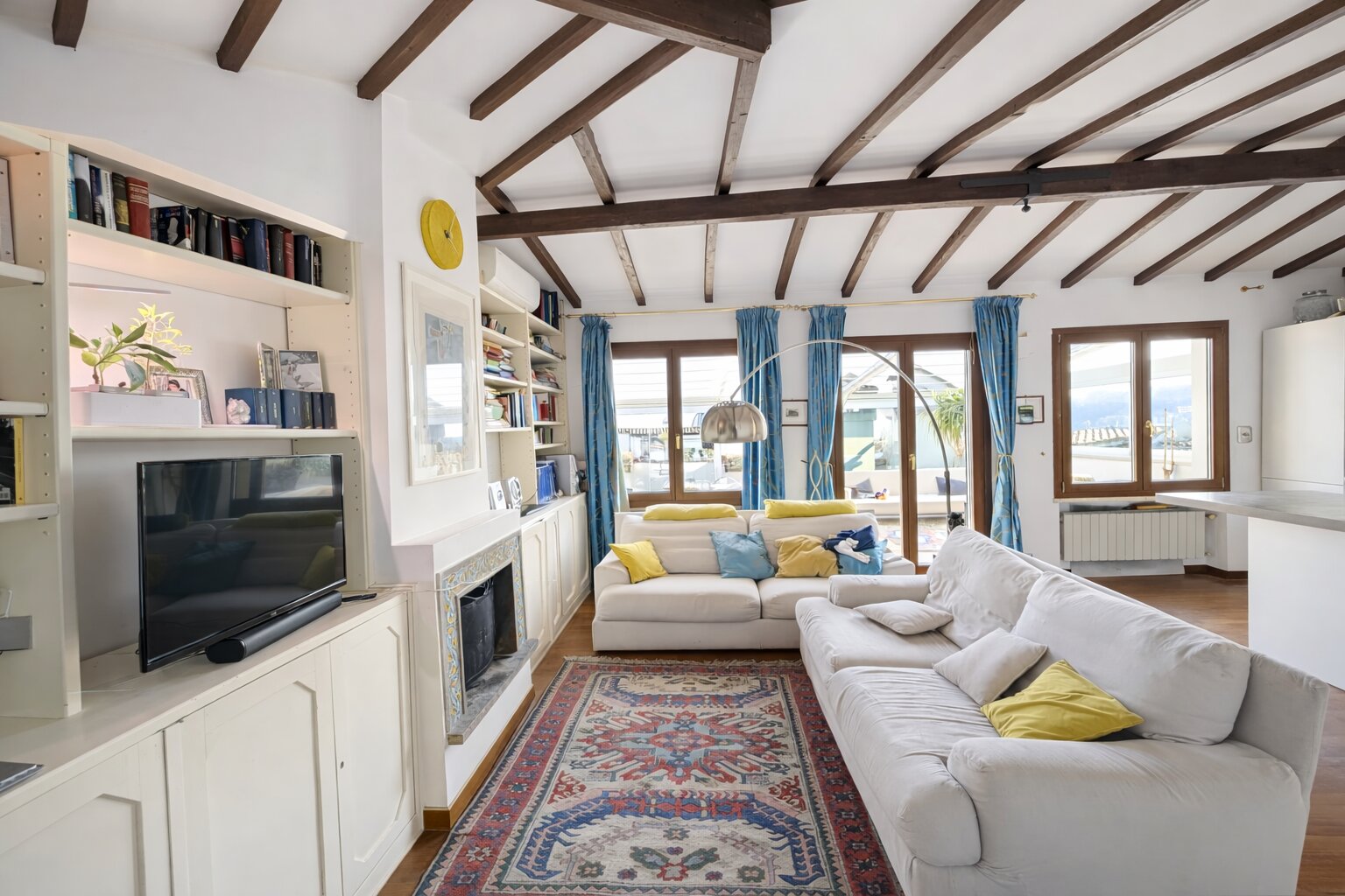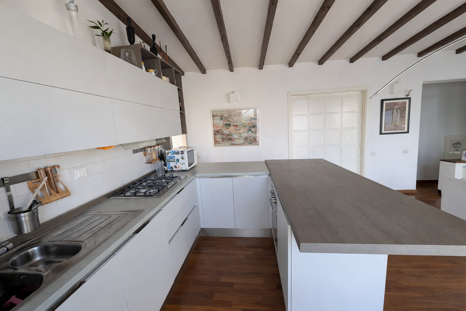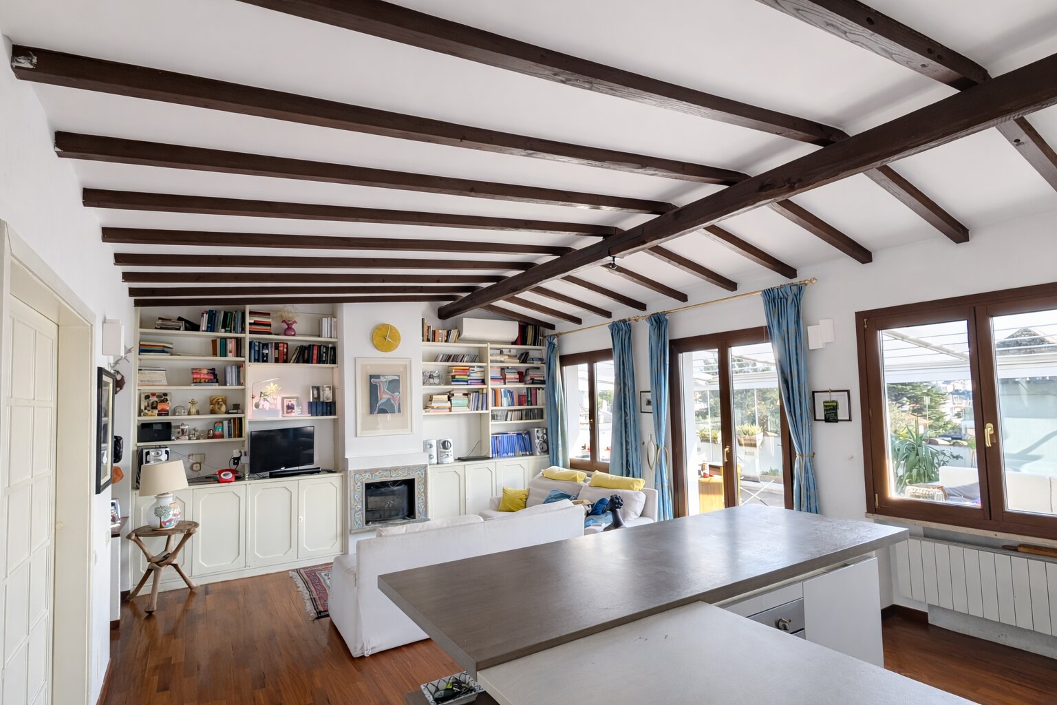 della casa è l’ampia zona living con camino e cucina a penisola, perfettamente collegata al grande terrazzo