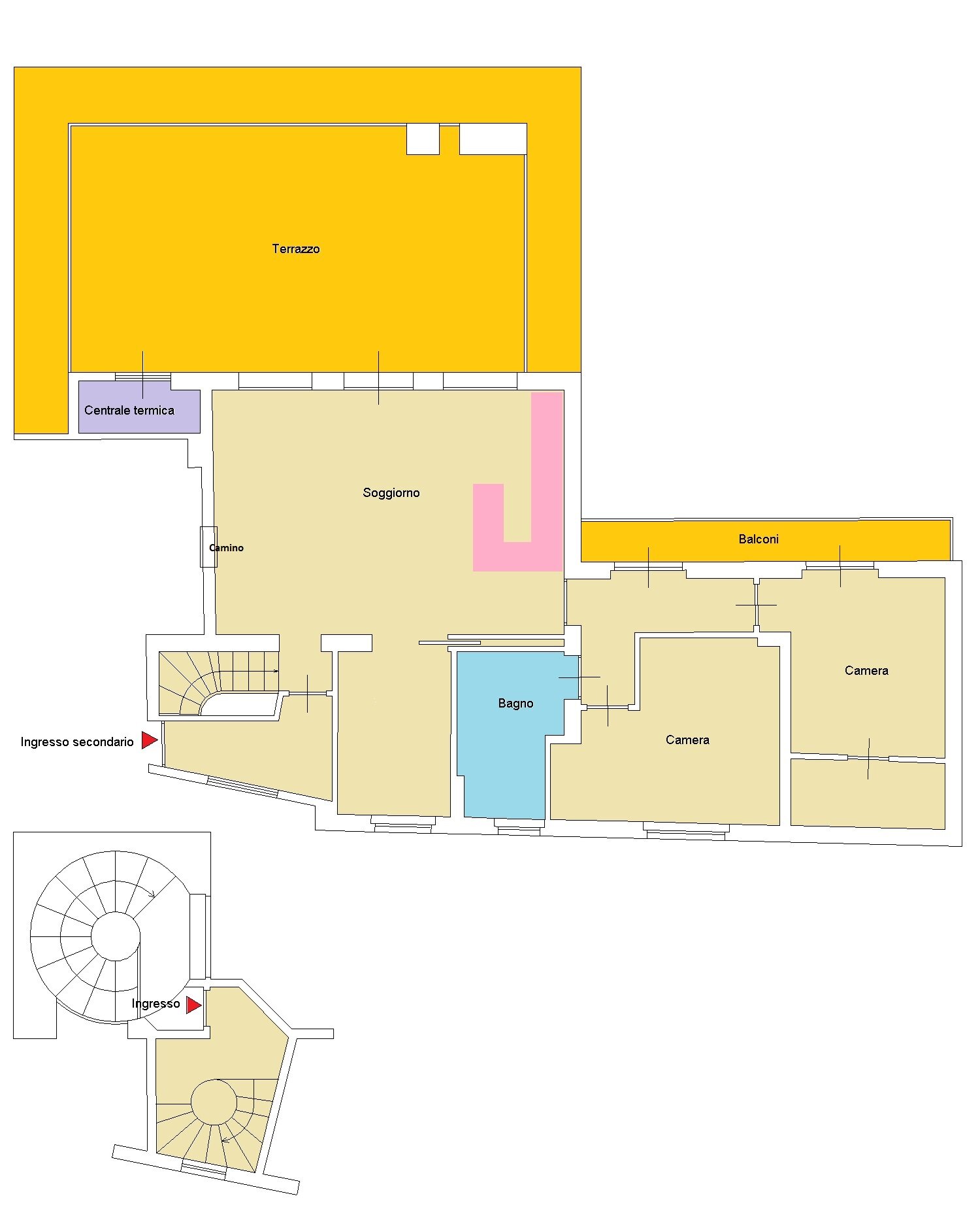 L’accesso principale avviene dal terzo piano attraverso una scenografica scala condominiale elicoidale che